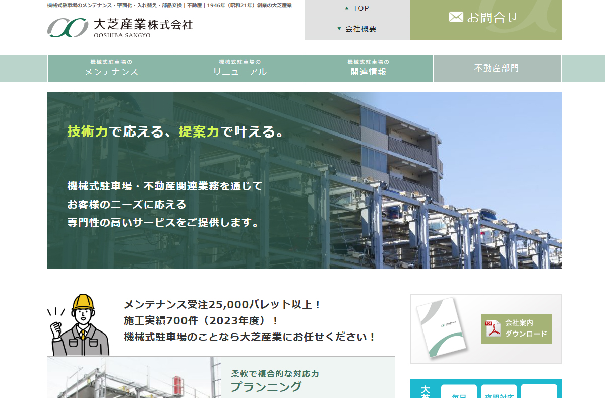 大芝産業株式会社は、1946年創業の歴史を持ち、機械式駐車場のメンテナンスと不動産事業を柱とする専門企業です。東京都大田区に本社を構え、独立系メンテナンス会社として特定のメーカーに依存しない柔軟な対応力を強みとしています。